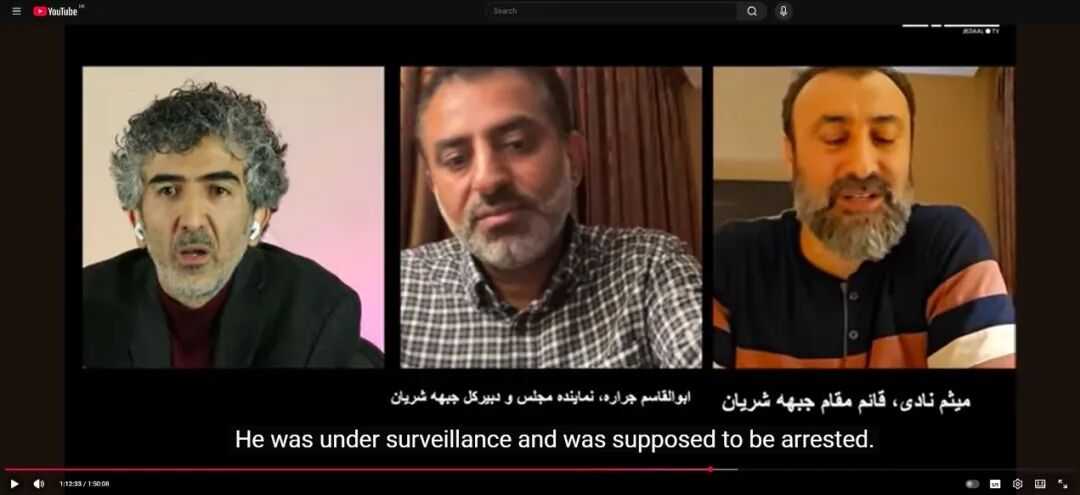 關(guān)鍵詞檢索發(fā)現(xiàn),1月15日,賈拉雷和納迪共同參與了一場由政治分析人士阿里·阿里扎達(dá)(Ali Alizadeh)主持的YouTube直播,相關(guān)視頻可以在YouTube 頻道Jedaal Farsi上找到。