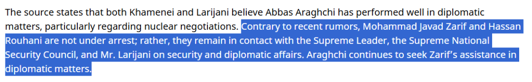 有專注伊朗事務(wù)的網(wǎng)絡(luò)媒體IranWire發(fā)布文章,否認(rèn)“魯哈尼等人被捕”一事。文章援引前伊朗官員說法,稱扎里夫和魯哈尼并未被捕,且仍然與目前伊朗政權(quán)的關(guān)鍵人物就安全和外交事務(wù)保持著聯(lián)絡(luò)。