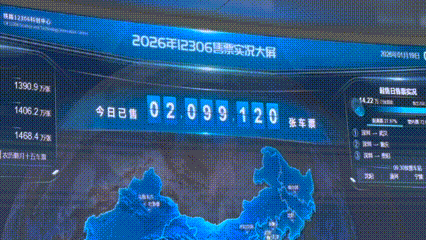 1月19日,2026年春運(yùn)火車票起售。在鐵路12306監(jiān)控中心現(xiàn)場(chǎng)大屏幕上,全國(guó)火車票的售票數(shù)據(jù)正在實(shí)時(shí)刷新。