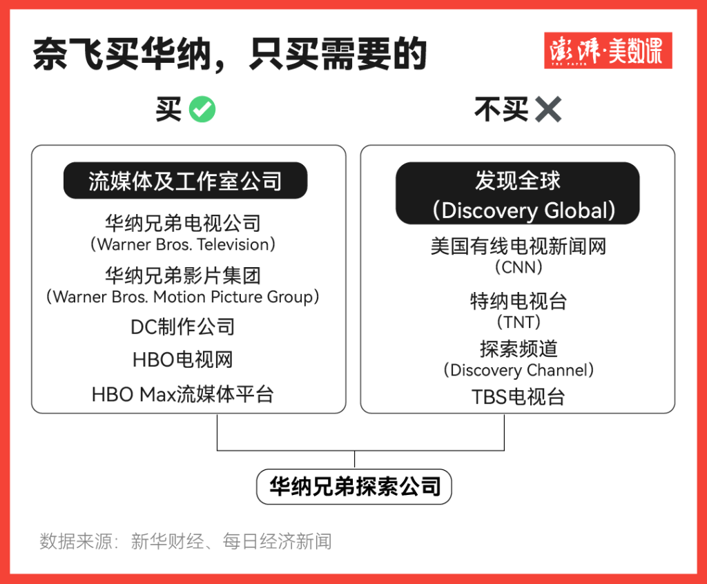 所以奈飛想收購的也僅僅是華納兄弟的IP、內(nèi)容庫和制作能力,而非全盤收購。根據(jù)協(xié)議,奈飛將收購華納兄弟,包括其電影和電視工作室、HBOMax流媒體和HBO。華納兄弟必須在交割前完成有線電視業(yè)務(wù)剝離,包括CNN、TBS、TNT等有線電視頻道均不在收購范圍內(nèi)。