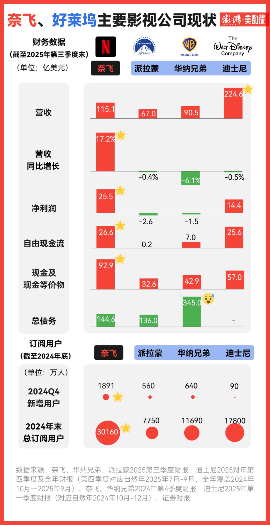 相比之下,奈飛在三季度末的財報中表現(xiàn)出色,凈利潤、現(xiàn)金、營收同比增長均領(lǐng)先,且總債務(wù)最少。其全球付費訂閱用戶突破3億,新增用戶數(shù)量也一騎絕塵。在公布新合作方式的當(dāng)天,奈飛還公布了其2025年第四季度財報,營收繼續(xù)提升,達(dá)121億美元。穩(wěn)定的訂閱收入為奈飛提供了傳統(tǒng)影視公司難以比擬的、可預(yù)測的持續(xù)現(xiàn)金流。