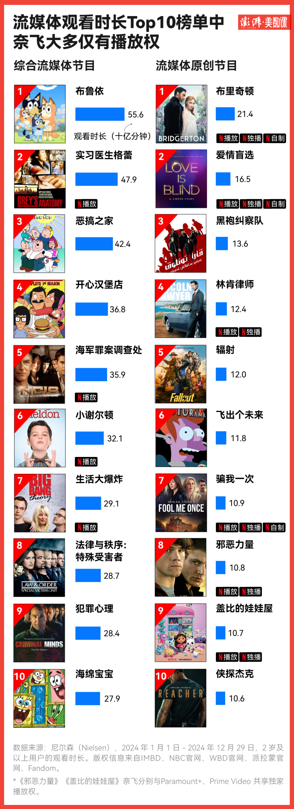 尼爾森的數(shù)據(jù)顯示,在2024年綜合流媒體節(jié)目排行中,Netflix多以“播放方”而非“版權(quán)方”身份出現(xiàn),雖在流媒體原創(chuàng)內(nèi)容榜上有名,但節(jié)目觀看時長遠(yuǎn)低于經(jīng)典熱播劇。也就是說,雖然奈飛在“爆款制造”方面成績斐然,但與訂閱變現(xiàn)掛鉤的觀看時長,還是得靠外購的“長青經(jīng)典IP”。