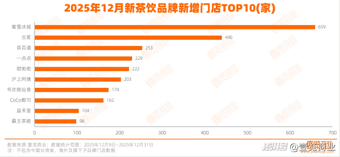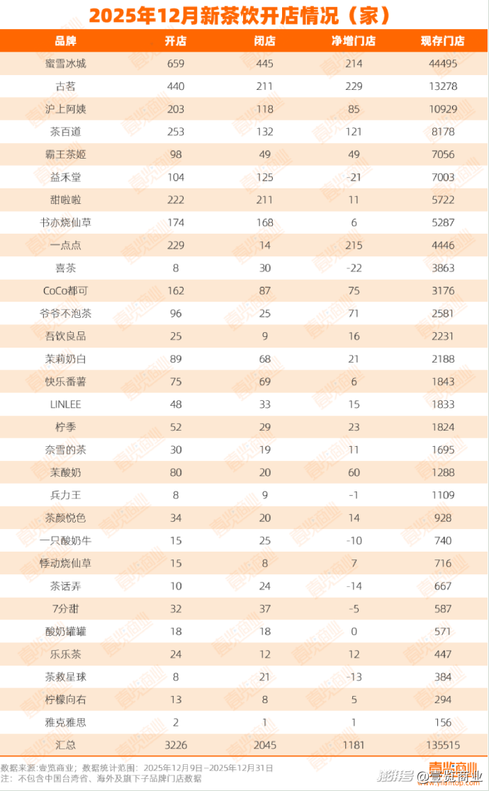 2025年12月,新茶飲門店拓展速度增快。壹覽商業(yè)監(jiān)測(cè)的30個(gè)連鎖茶飲品牌合計(jì)現(xiàn)有門店總量13.55萬家,單月新開3226家、關(guān)閉2045家,凈增長(zhǎng)1181家。