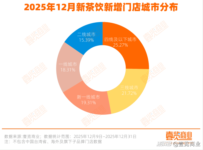 從新增門店的城市分布來看,新茶飲在四線及以下城市新增最多,占比25.27%,這表明下沉市場(chǎng)已成為茶飲拓店的主要來源;三線城市表現(xiàn)同樣突出,新增門店占比為21.72%;二線城市新增最少,占比15.39%。