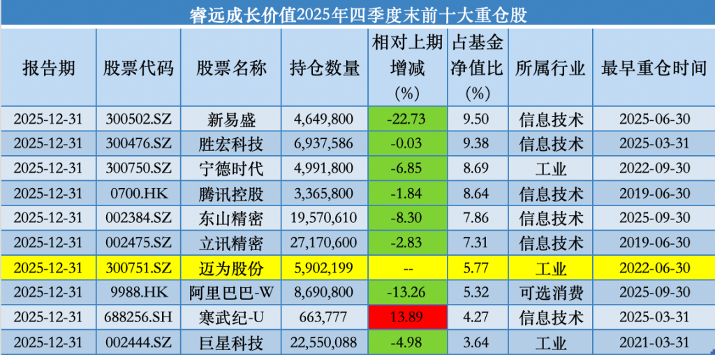 具體來(lái)看,2025年四季報(bào)顯示,睿遠(yuǎn)成長(zhǎng)價(jià)值混合的前十大重倉(cāng)股依次為新易盛(300502.SZ)、勝宏科技(300476.SZ)、寧德時(shí)代(300750.SZ)、騰訊控股(00700.HK)、東山精密(002384.SZ)、立訊精密(002475.SZ)、邁為股份(300751.SZ)、阿里巴巴(09988.HK)、寒武紀(jì)(688256.SH)、巨星科技(002444.SZ)。