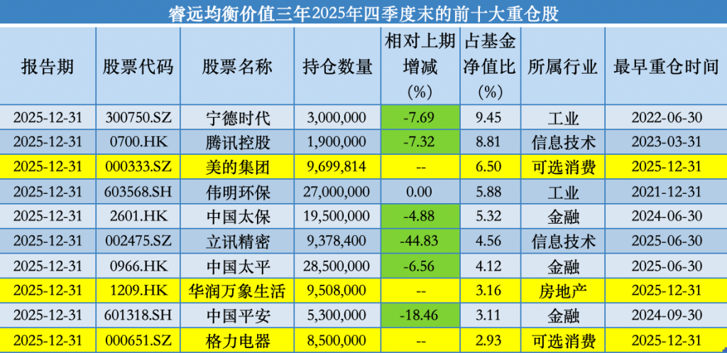 具體來(lái)看,2025年四季度期間,睿遠(yuǎn)均衡價(jià)值三年持有的持倉(cāng)前十更迭了3只個(gè)股,前十大重倉(cāng)股依次為:寧德時(shí)代、騰訊控股、美的集團(tuán)(000333.SZ)、偉明環(huán)保(603568.SH)、中國(guó)太保(601601.SH)、立訊精密、中國(guó)太平、華潤(rùn)萬(wàn)象生活(01209.HK)、中國(guó)平安(601318.SH)、格力電器(000651.SZ)。