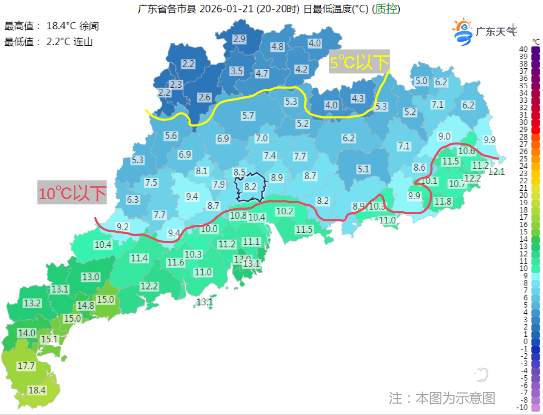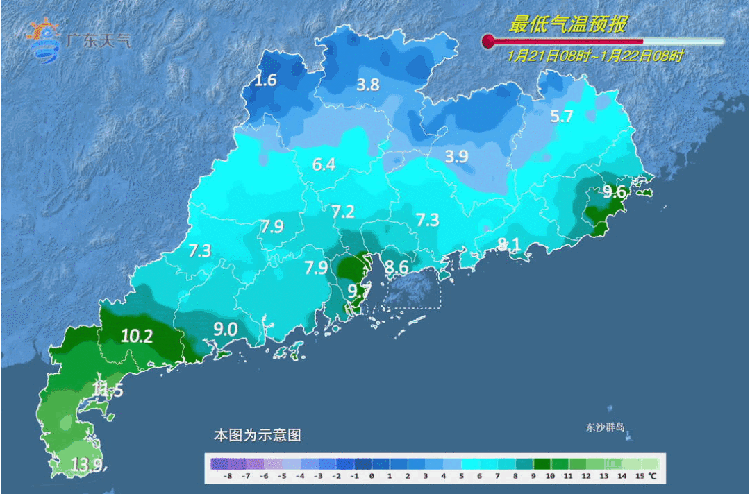 氣溫方面,今明兩天全省大部市縣氣溫繼續(xù)小幅下降,過程最低氣溫將出現(xiàn)在22日早晨。21-23日,粵北市縣仍將有大范圍5℃以下的低溫天氣,粵北高海拔山區(qū)-4~0℃,有雨夾雪、凍雨或冰霜凍,請繼續(xù)加強防寒保暖。