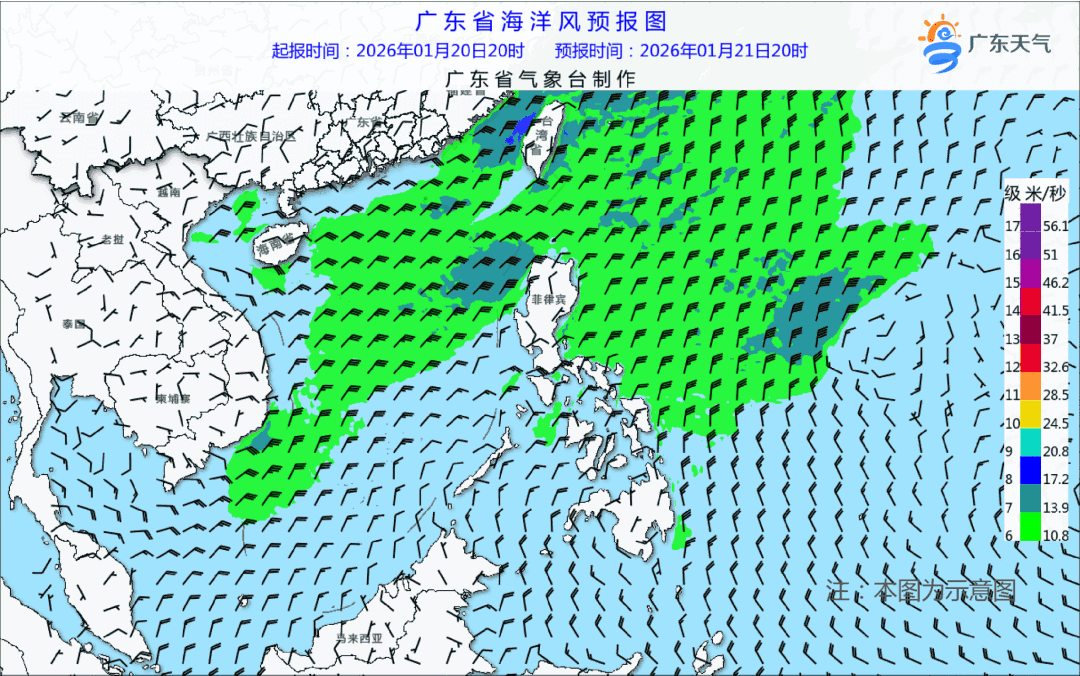 21-22日,粵東海面東北風(fēng)7級陣風(fēng)8級,廣東省中西部海面東北到東風(fēng)6級陣風(fēng)7級,臺灣海峽、巴士海峽、南海東北部海面東北風(fēng)7~8級陣風(fēng)9級。23日各海區(qū)風(fēng)力趨于減弱。
