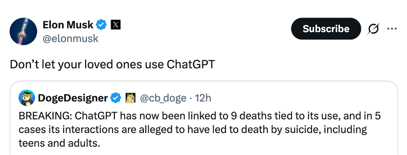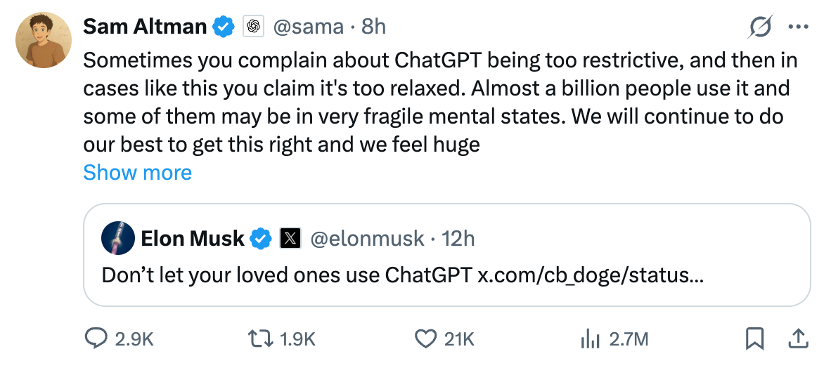 OpenAI CEO山姆·奧特曼(Sam Altman)隨即在X上回應(yīng)。他不僅為OpenAI的產(chǎn)品和安全措施辯護(hù),還將矛頭直接轉(zhuǎn)向了特斯拉的自動駕駛技術(shù),發(fā)文稱, “我只坐過一次裝有該系統(tǒng)的車,但我第一感覺是特斯拉推出這個東西遠(yuǎn)談不上安全。”