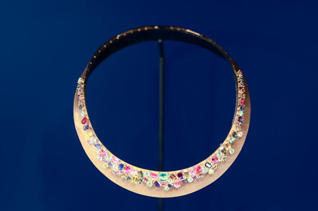 “精湛技藝”展區(qū)仿若將賓客帶至瑞士仙子坡的高級(jí)工坊。Curved Artistry弧光藝境主題項(xiàng)鏈以八角形黃藍(lán)寶石搭配隕硫鐵等非凡材質(zhì),展現(xiàn)對(duì)色彩與形態(tài)的大膽探索。Arty Pop流行藝術(shù)主題墜飾時(shí)計(jì)則以叛逆的波普藝術(shù)精神,通過孔雀石、綠玉髓與鉆石的鑲嵌,構(gòu)筑精密的視覺層次。在這里,品牌引以為傲的微釘鑲、雪花鑲嵌及獨(dú)家55刻面馬眼形切割等技藝被一一剖析,見證工匠以手作溫度賦予寶石永恒生命。