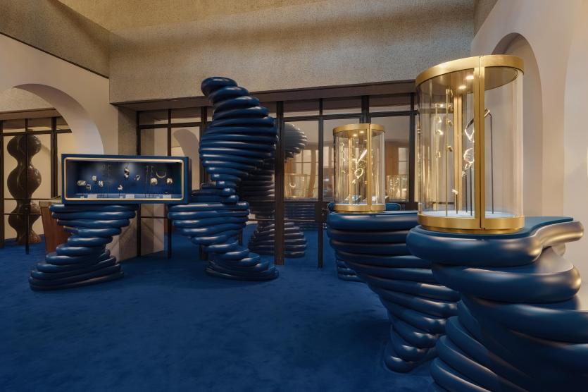 Cynthia Tabet:我們希望通過全方位的沉浸式體驗(yàn)來傳遞這一精神。你可以看到貫穿始終的品牌標(biāo)志性藍(lán)色與金色,它們構(gòu)成了強(qiáng)烈的視覺符號(hào)。展覽的設(shè)計(jì)靈感源自六七十年代,那是一個(gè)設(shè)計(jì)語言充滿膽識(shí)的年代。在整個(gè)觀展旅程中,我們刻意將傳承已久的古董作品與當(dāng)代創(chuàng)作并置,讓過去與當(dāng)下直接對(duì)話。我們相信,這種策展方式本身就呼應(yīng)了張園這個(gè)地方連結(jié)歷史與現(xiàn)代的特質(zhì),也是我們想傳達(dá)的品牌姿態(tài)。
