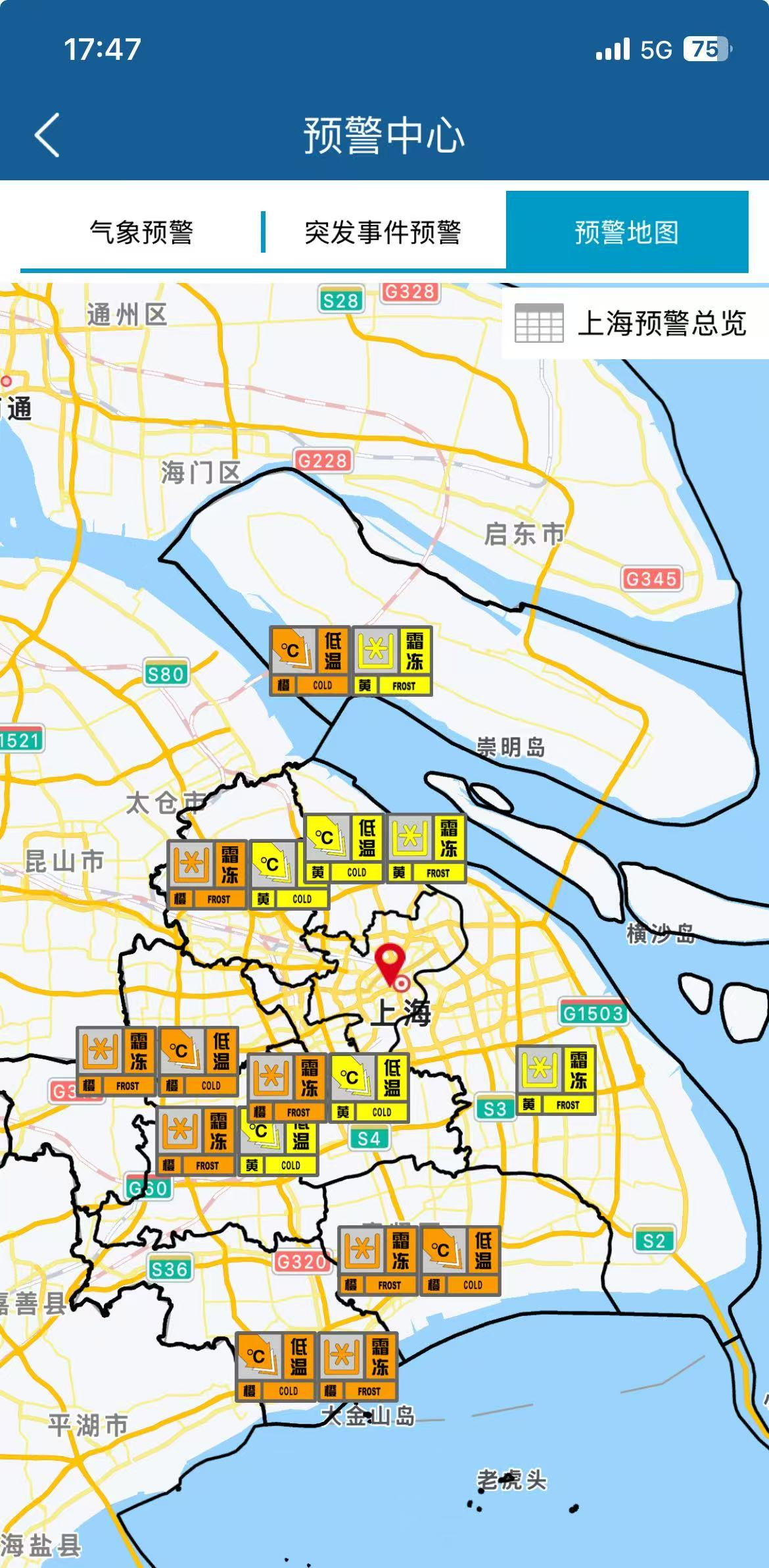 此外,松江區(qū)氣象臺(tái)16時(shí)15分發(fā)布低溫黃色預(yù)警信號(hào)、霜凍橙色預(yù)警信號(hào);奉賢區(qū)氣象臺(tái)16時(shí)15分發(fā)布低溫橙色預(yù)警信號(hào)、霜凍橙色預(yù)警信號(hào);閔行區(qū)氣象臺(tái)16時(shí)17分發(fā)布低溫黃色預(yù)警信號(hào)、霜凍橙色預(yù)警信號(hào);崇明區(qū)氣象臺(tái)16時(shí)21分發(fā)布低溫橙色預(yù)警信號(hào)、霜凍黃色預(yù)警信號(hào);青浦區(qū)氣象臺(tái)16時(shí)27分發(fā)布低溫橙色預(yù)警信號(hào)、霜凍橙色預(yù)警信號(hào);寶山區(qū)氣象臺(tái)16時(shí)35分發(fā)布低溫黃色預(yù)警信號(hào)、霜凍黃色預(yù)警信號(hào);浦東新區(qū)氣象臺(tái)16時(shí)40分發(fā)布霜凍黃色預(yù)警信號(hào);嘉定區(qū)氣象臺(tái)16時(shí)49分發(fā)布低溫黃色預(yù)警信號(hào)、霜凍橙色預(yù)警信號(hào)。