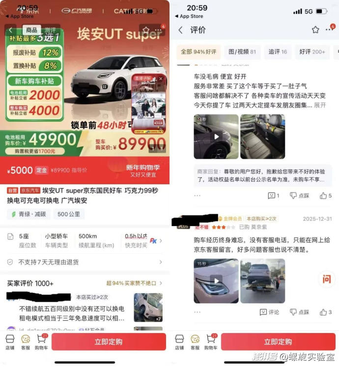 以首輛“國民好車”埃安UT super為例,截至去年12月,已累計(jì)交付1000輛,線上成交占比高達(dá) 99%。但從官方旗艦店的評價(jià)來看,不少用戶吐槽服務(wù)不到位、溝通不清晰等,看來對于不太熟練的賣車業(yè)務(wù),京東客服還要再提升服務(wù)質(zhì)量才行。