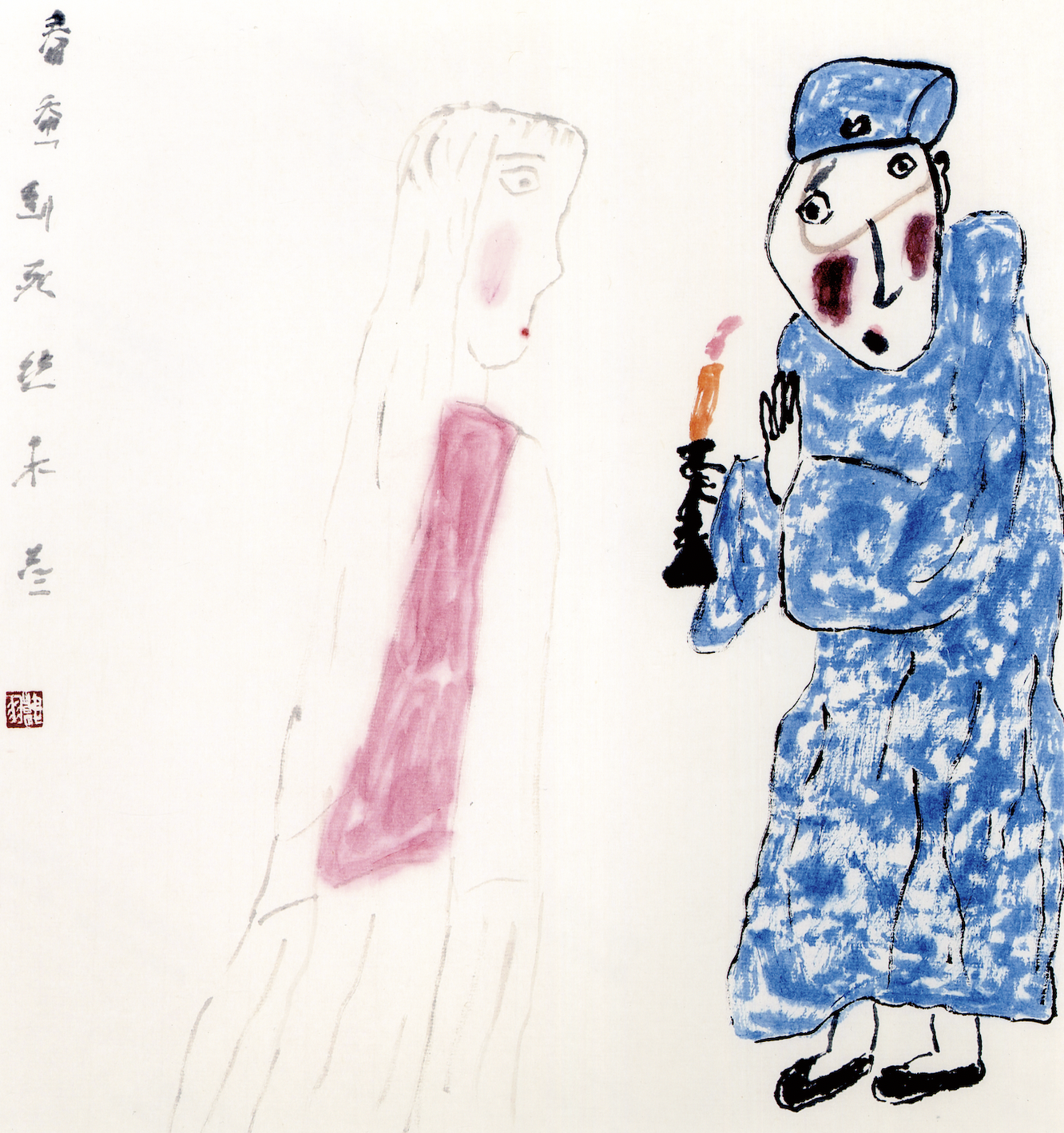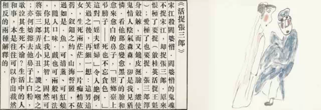 畫漂亮了又不像鬼,怎么辦?這個問題,我畫《活捉張三郎》,從70年代末就開始琢磨了,又不能畫丑了,又得畫出鬼氣來。我這個問題可能也很笨,我從1970年末到2000年,到新世紀了才解決了這個問題,30年,就這么一個問題,我才解決了。跟你一說,看著很稀松(很平常),把我《水滸》那本書拿來,你一看就明白了,30年才解決??墒俏乙徽f出來,人家說就這么屁大的事,你30年才解決?看,這是張三郎,這個是閻婆惜,這個活人很清楚,這個是似隱似現(xiàn),模模糊糊的,像個鬼魂嘛,但又不能把她畫得很丑。就這么一個不大的事,我30年才想出來,也畫出來了,包括咱們畫畫的人誰也沒注意到這個問題,也沒人從這(戲曲人物畫角度)來看。