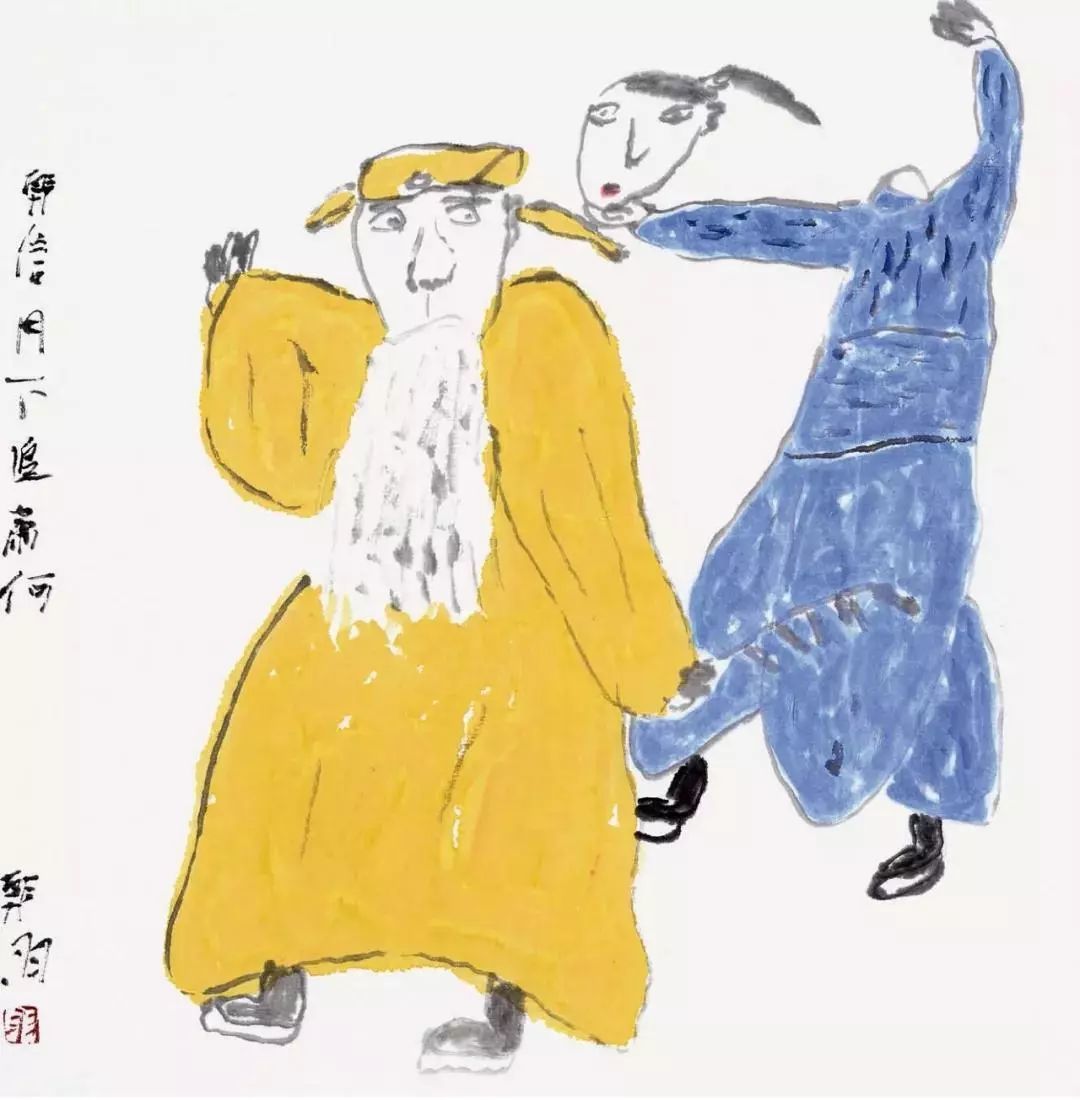 韓羽:因為從這一段,你就可以區(qū)分什么叫戲畫,我韓羽為什么要畫戲,為什么不畫別的?如果說從創(chuàng)作方法來說,從現(xiàn)實主義的繪畫創(chuàng)作方法,他為什么要畫戲?是不是因為大花臉好看才畫?那就沒必要了,大花臉也未必就好看。因為戲曲中,人們要想講道理,必須得有標本,做這個事是對的,做那個是錯的,光說不行,你沒有表演人家就認不清你說什么,就像瞎子說黑白,什么叫黑的什么叫白的?他不知道。就像說話要講典故,典故就是把古人來比喻,一說武松,都知道,關云長、曹操,每個人的檔案都在全中國所有人的腦子里都有,你不必要再介紹他的檔案,一說他名字馬上就知道。戲曲人物,最清楚的比喻就是古人,大家最熟悉的古人就在戲臺上,所以才用他們來說事。如果說沒這個意義,誰畫他們干什么?跟現(xiàn)在什么都不一樣,長毛大胸,又是花臉,又是黑白小丑,有什么意思?以戲曲為題材,就是因為這些人們都熟悉,你不必要再介紹他其他的,一說都知道。