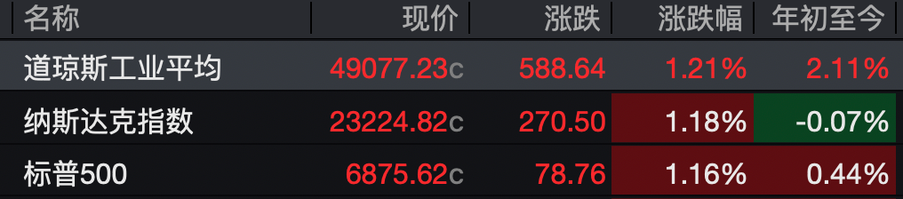 當?shù)貢r間1月21日,美國股市大幅反彈,三大指數(shù)均漲超1%。截至收盤,道瓊斯指數(shù)漲1.21%,報49077.23點;標普500指數(shù)漲1.16%,報6875.62點;納斯達克指數(shù)漲1.18%,報23224.82點。