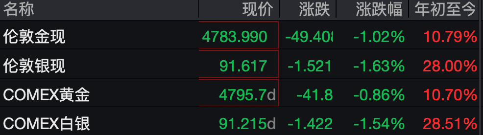 此外,隨著特朗普就格陵蘭問題接連釋放“降溫”信號,引發(fā)黃金價格急跌,期現(xiàn)貨黃金雙雙下跌超1%失守4800美元/盎司,目前現(xiàn)貨黃金交投在4780美元/盎司附近,COMEX黃金交投在4790美元/盎司附近?,F(xiàn)貨白銀則大跌超2%,交投在91美元/盎司。