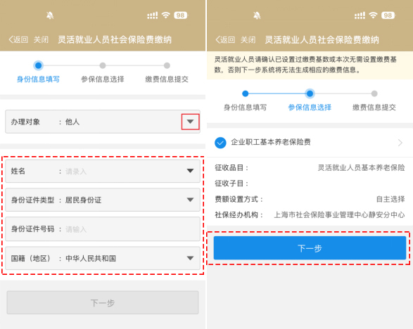 若需為他人繳費(fèi),點(diǎn)開“辦理對(duì)象”,選擇“他人”,點(diǎn)擊“確定”,錄入他人的姓名和身份證件號(hào)碼后再點(diǎn)擊“下一步”→進(jìn)入“參保信息選擇”,系統(tǒng)自動(dòng)帶出繳費(fèi)人參保險(xiǎn)種信息,核實(shí)確認(rèn)無(wú)誤后,點(diǎn)擊“下一步”;