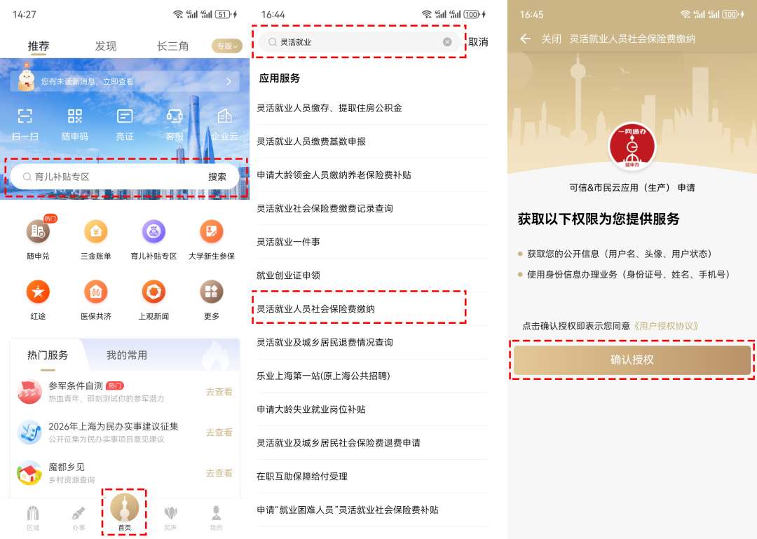 實(shí)名注冊(cè)并登錄“隨申辦市民云”APP→首頁(yè)搜索框中輸入關(guān)鍵字“靈活就業(yè)”→點(diǎn)擊“靈活就業(yè)人員社會(huì)保險(xiǎn)費(fèi)繳納”進(jìn)入服務(wù)頁(yè)面 →并確認(rèn)授權(quán);