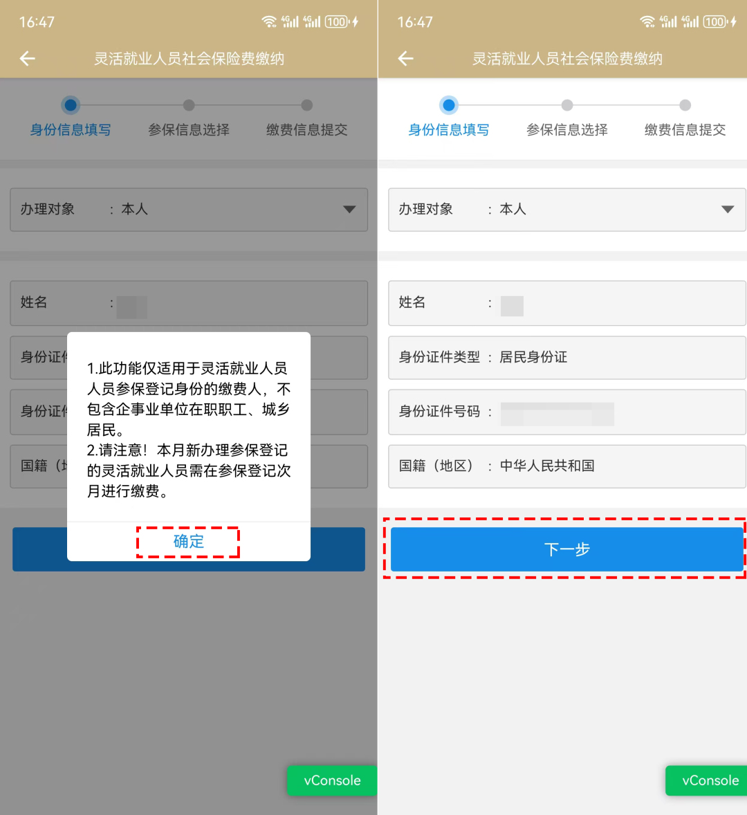 核對(duì)【姓名】【證件號(hào)碼】【就業(yè)登記日期】信息后,根據(jù)本人實(shí)際情況,選擇對(duì)應(yīng)【管理區(qū)縣】,并在【靈活就業(yè)參?!窟x項(xiàng)內(nèi)選擇【是】后,系統(tǒng)將自動(dòng)生成繳費(fèi)起始年月。點(diǎn)擊“下一步”→頁(yè)面提示以下信息,即表示已辦理成功。