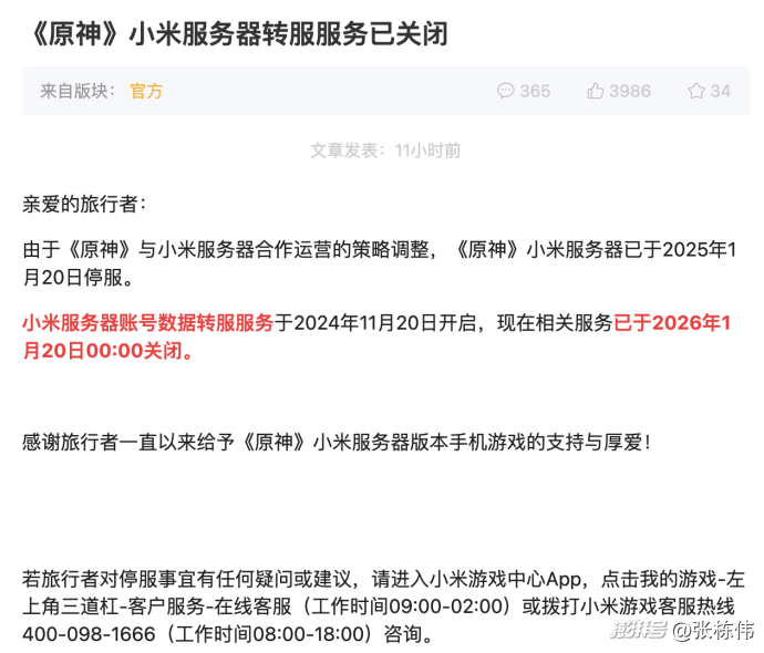 2026年1月20日,米哈游通過米游社官宣《原神》小米服務(wù)器轉(zhuǎn)服服務(wù)正式關(guān)閉,未遷移的玩家賬號數(shù)據(jù)將永久鎖定;