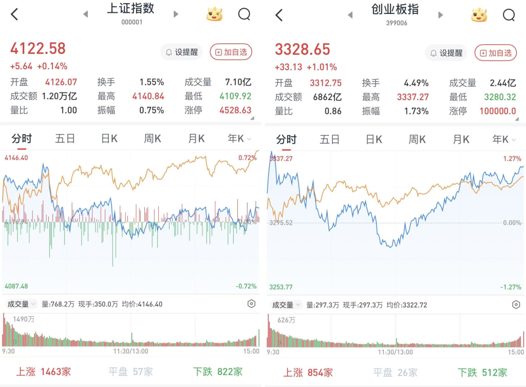 至收盤,上證綜指漲0.14%,報4122.58點;科創(chuàng)50指數(shù)漲0.41%,報1541.64點;深證成指漲0.5%,報14327.05點;創(chuàng)業(yè)板指漲1.01%,報3328.65點。