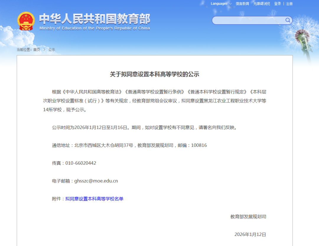 1月12日,教育部網(wǎng)站發(fā)布《關(guān)于擬同意設(shè)置本科高等學(xué)校的公示》,擬同意設(shè)置黑龍江農(nóng)業(yè)工程職業(yè)技術(shù)大學(xué)等14所學(xué)校。公示時(shí)間為2026年1月12日至1月16日。