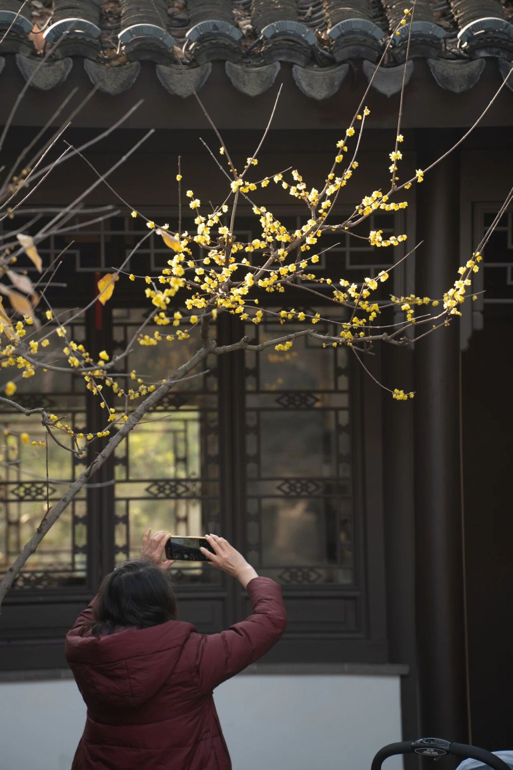古猗園蠟梅綻放,游客在拍照。 園方 供圖
