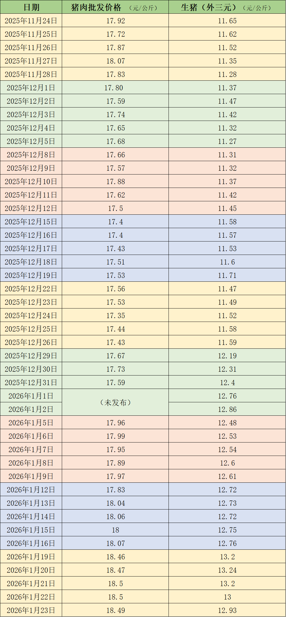 據(jù)農(nóng)業(yè)農(nóng)村部監(jiān)測(cè),1月23日,全國(guó)農(nóng)產(chǎn)品批發(fā)市場(chǎng)豬肉平均價(jià)格為18.49元/公斤,與上周五(1月16日)的18.07元/公斤相比,上漲2.3%。本周的平均價(jià)格為18.5元/公斤,與上周18元/公斤的均價(jià)相比,上漲2.8%。