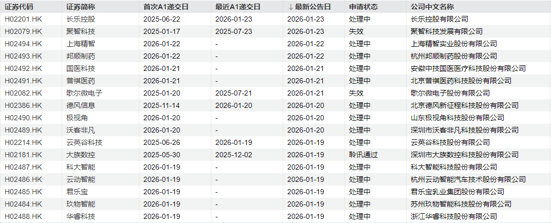其中,上海精智實(shí)業(yè)股份有限公司、杭州邦順制藥股份有限公司、安徽中技國(guó)醫(yī)醫(yī)療科技股份有限公司、北京普祺醫(yī)藥科技股份有限公司、山東極視角科技股份有限公司、深圳市沃客非凡科技股份有限公司、科大智能科技股份有限公司、杭州云動(dòng)智能汽車(chē)技術(shù)股份有限公司、君樂(lè)寶乳業(yè)集團(tuán)股份有限公司、蘇州玖物智能科技股份有限公司、浙江華??萍脊煞萦邢薰镜?1家公司為首次遞交。