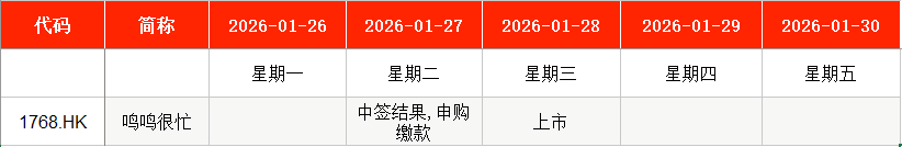 港股方面,Wind數(shù)據(jù)顯示,本周(1月26日至1月30日),鳴鳴很忙(01768.HK)將于本周三上市。