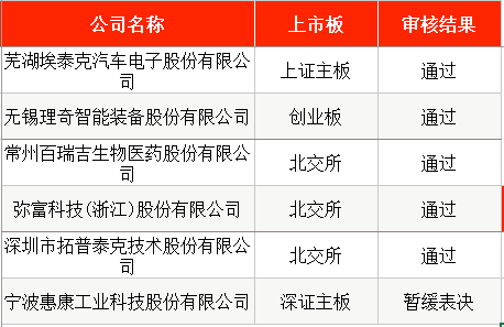 其中,擬在上交所主板IPO的蕪湖埃泰克汽車(chē)電子股份有限公司(下稱(chēng)“埃泰克”),擬在創(chuàng)業(yè)板IPO的無(wú)錫理奇智能裝備股份有限公司(下稱(chēng)“理奇智能”),擬在北交所IPO的常州百瑞吉生物醫(yī)藥股份有限公司(下稱(chēng)“百瑞吉”)、彌富科技(浙江)股份有限公司(下稱(chēng)“彌富科技”)、拓普泰克技術(shù)股份有限公司(下稱(chēng)“拓普泰克”)等,均成功過(guò)會(huì)。