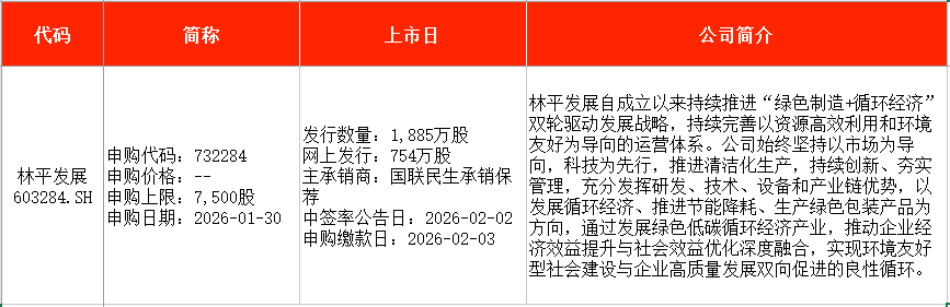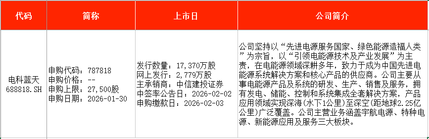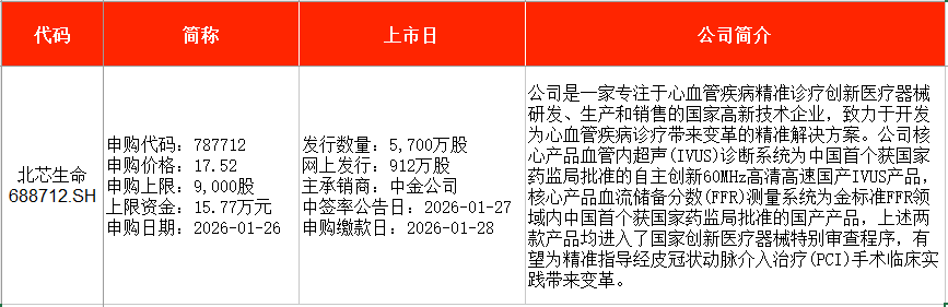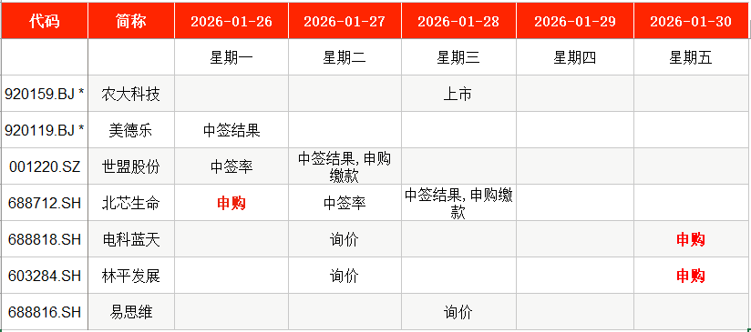從時(shí)間表看,北芯生命(688712)將在本周一(1月26日)申購(gòu),電科藍(lán)天(688818)、林平發(fā)展(603284)將在本周五(1月30日)申購(gòu)。