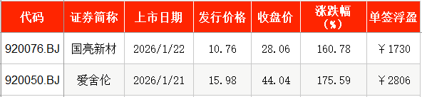 1月22日,國(guó)亮新材在北交所掛牌上市,發(fā)行價(jià)為10.76元/股,截至上市首日收盤(pán),該股報(bào)28.06元/股,漲幅為160.78%。以收盤(pán)價(jià)計(jì)算,投資者中一簽浮盈為1730元。