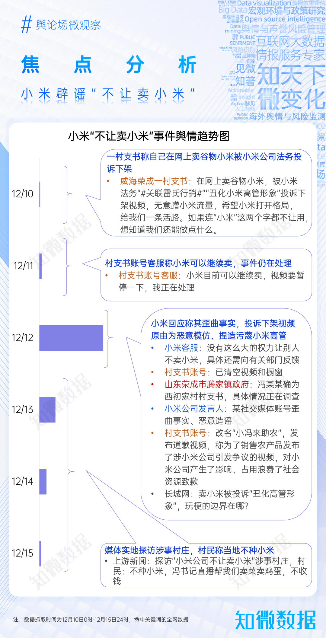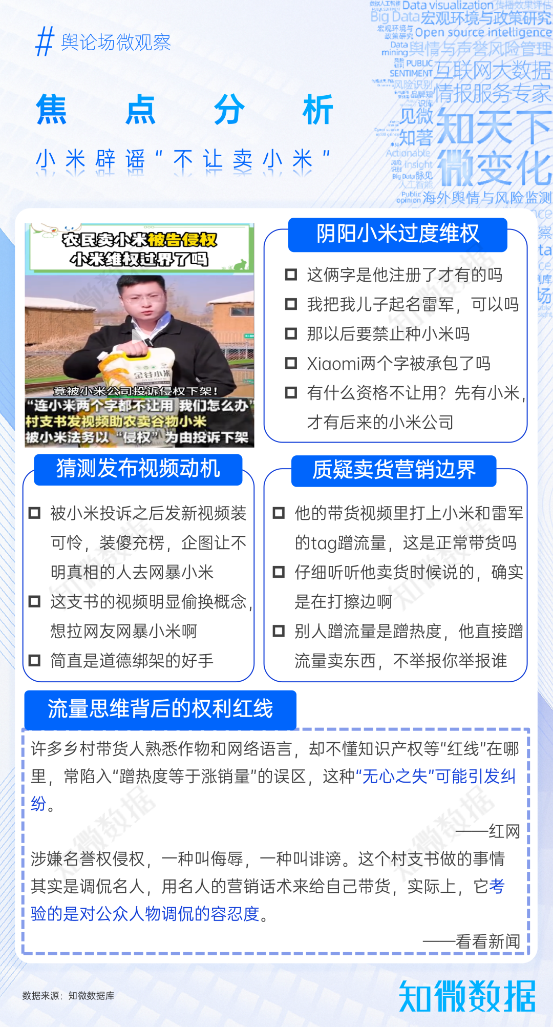 12月,山東威海某地一村支書(shū)稱,因賣谷物小米被小米公司以“丑化高管形象”為由投訴下架視頻,事件迅速引發(fā)熱議,關(guān)于小米是否過(guò)度維權(quán)的討論持續(xù)擴(kuò)散。