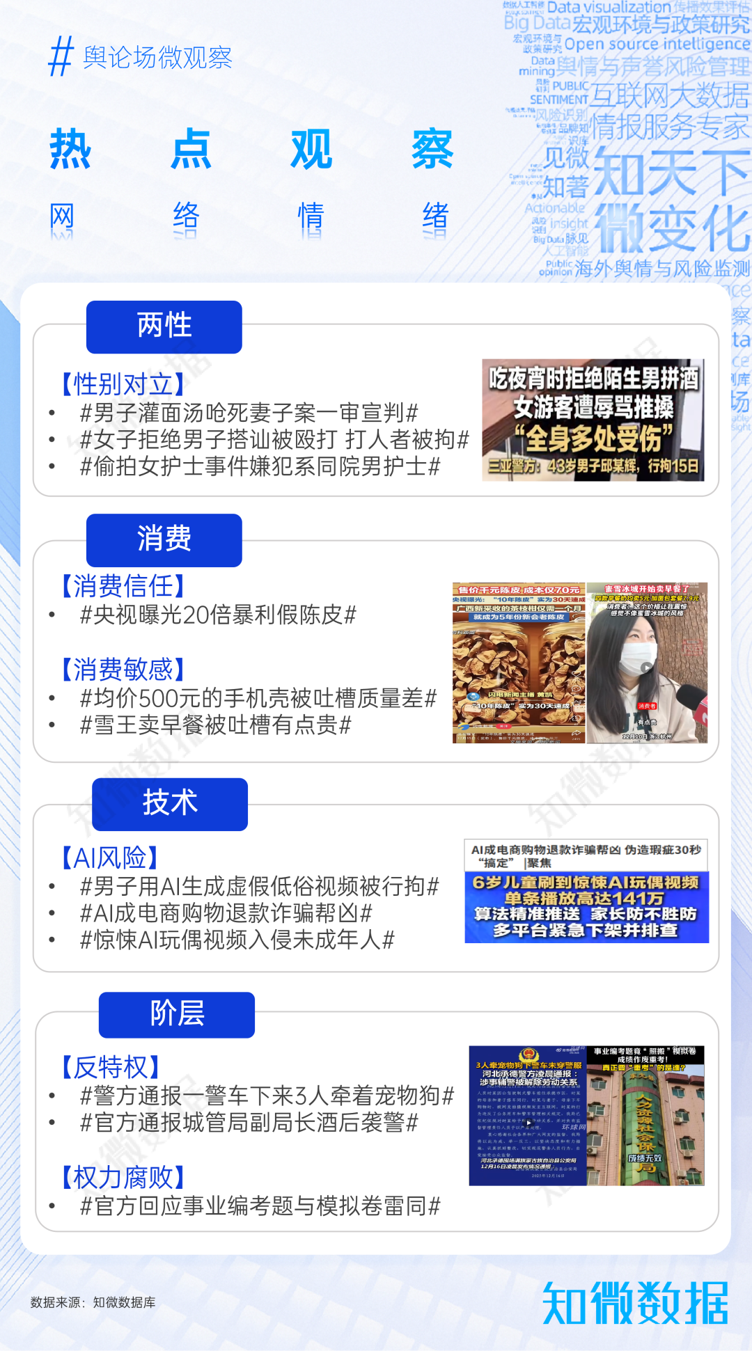 12月,兩性相關(guān)議題顯著;央視曝光20倍暴利假陳皮等事件引發(fā)消費(fèi)信任塌陷;AI濫用風(fēng)險(xiǎn)引發(fā)輿論擔(dān)憂;警車上下來(lái)三人牽著寵物狗等特權(quán)現(xiàn)象引關(guān)注。