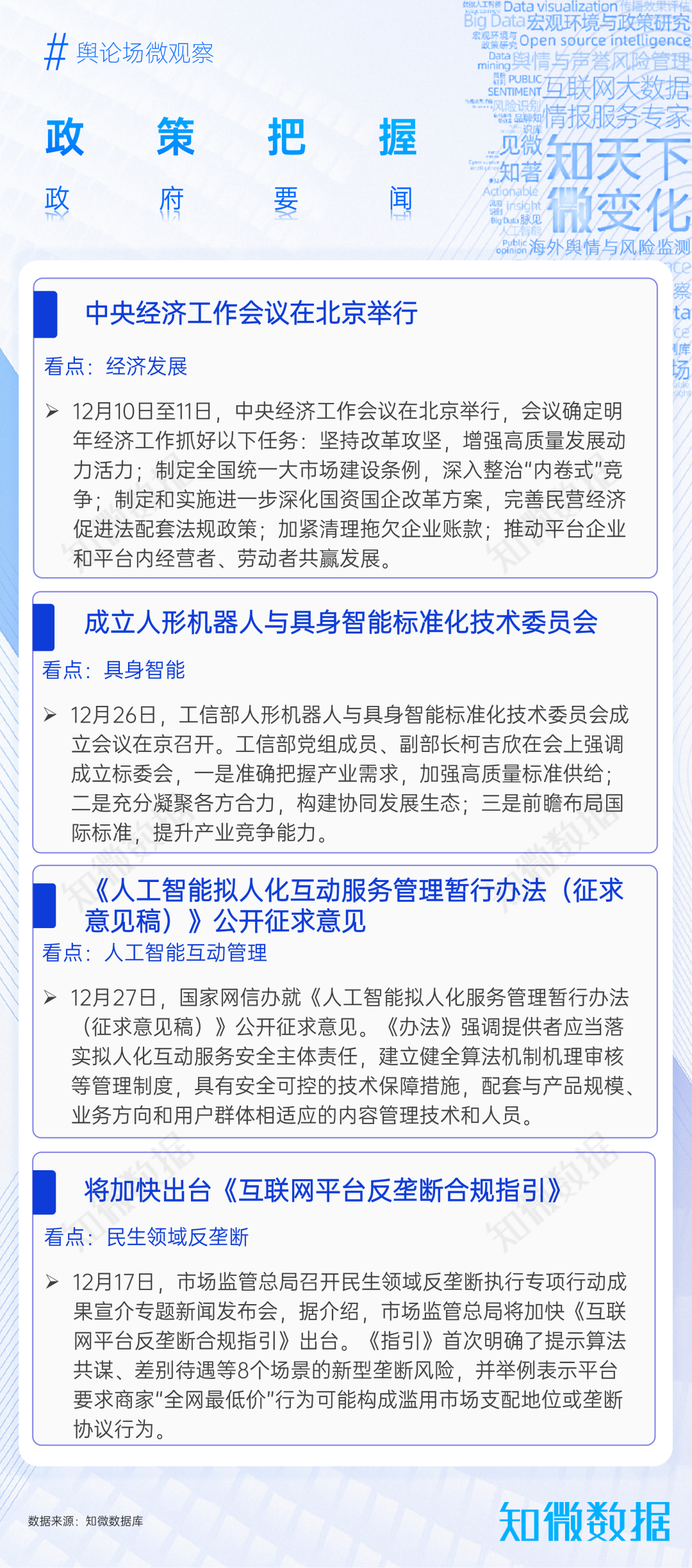 12月,多項(xiàng)舉措出臺(tái):中央經(jīng)濟(jì)工作會(huì)議部署一系列經(jīng)濟(jì)任務(wù);人形機(jī)器人與具身智能標(biāo)準(zhǔn)化技術(shù)委員會(huì)成立;國(guó)家網(wǎng)信辦就《人工智能擬人化服務(wù)管理暫行辦法(征求意見(jiàn)稿)》公開(kāi)征求意見(jiàn);市場(chǎng)監(jiān)管總局將加快出臺(tái)《互聯(lián)網(wǎng)平臺(tái)反壟斷合規(guī)指引》。這些措施統(tǒng)籌經(jīng)濟(jì)、科技與治理維度,凸顯高質(zhì)量發(fā)展與創(chuàng)新規(guī)范并重的戰(zhàn)略導(dǎo)向,為可持續(xù)發(fā)展奠定制度基礎(chǔ)。