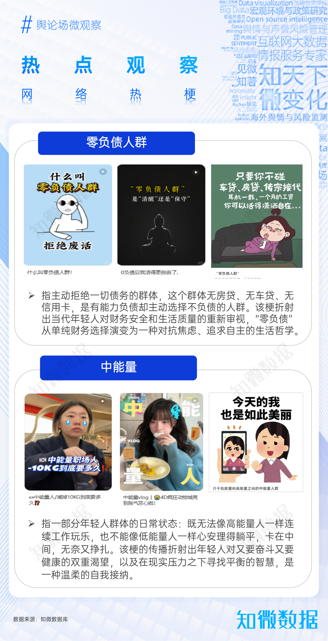 12月,“零負(fù)債人群”是年輕人對(duì)抗焦慮、追求自主的生活哲學(xué);“中能量”折射出年輕人在現(xiàn)實(shí)生存壓力之下尋找平衡的自我接納。