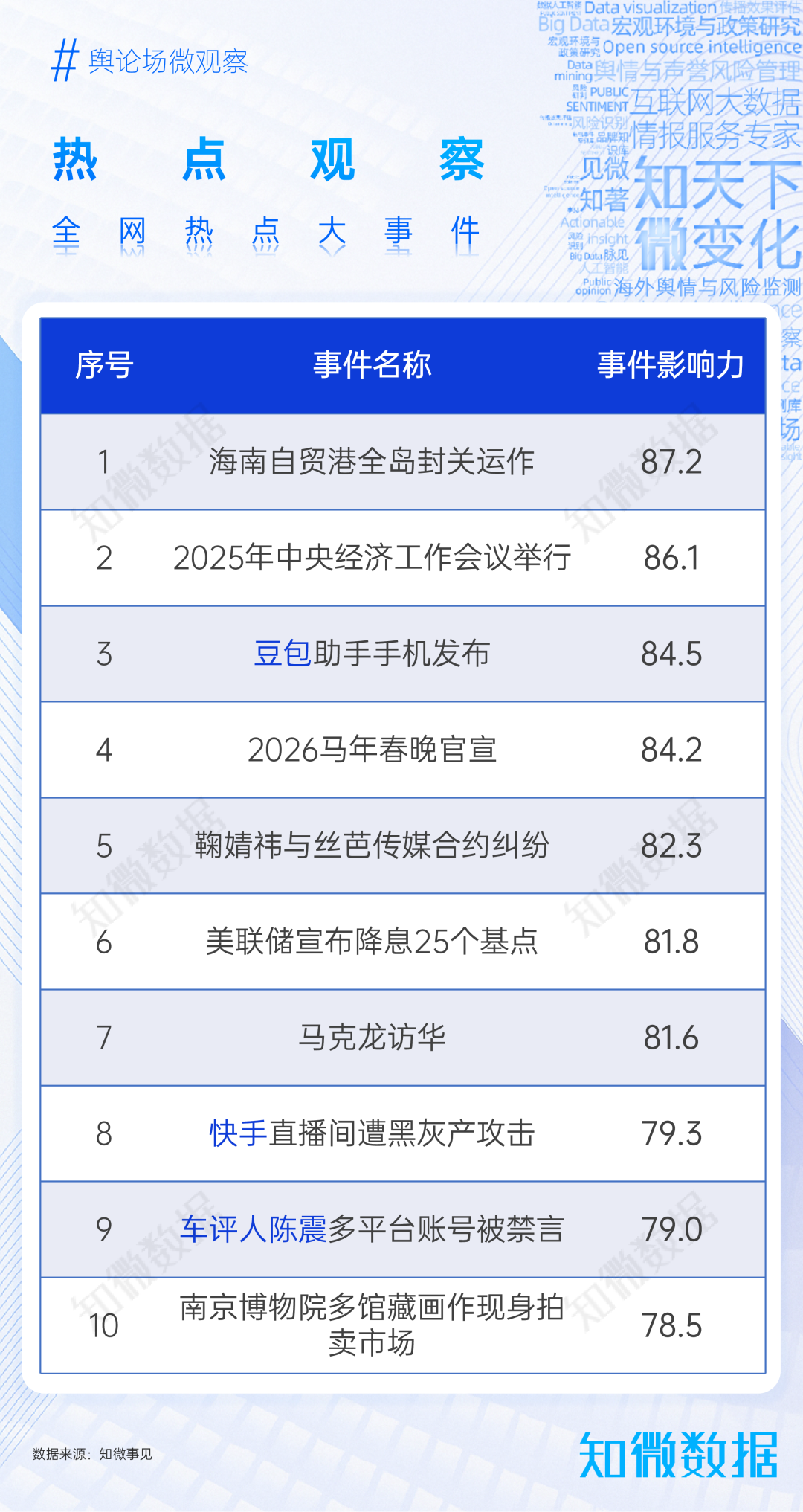 據(jù)知微事見(jiàn),12月,海南自貿(mào)港全島封關(guān)運(yùn)作、2025年中央經(jīng)濟(jì)工作會(huì)議舉行、豆包助手手機(jī)發(fā)布成為全網(wǎng)事件影響力前三。
