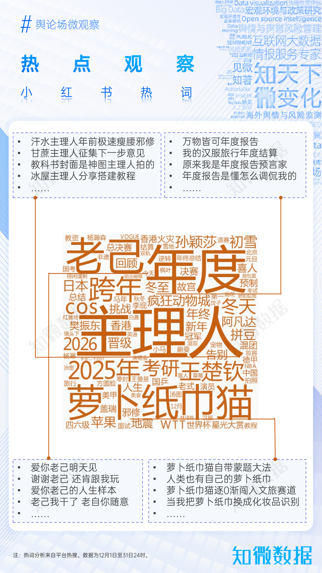 據(jù)知微輿論場(chǎng),12月小紅書(shū)平臺(tái),多圈層主理人再引熱議;各類2025年度報(bào)告掀起大范圍討論;愛(ài)你老己突然爆火引自我治愈熱潮;蘿卜紙巾貓的寵物治愈日常玩法實(shí)現(xiàn)了多圈層破圈傳播。