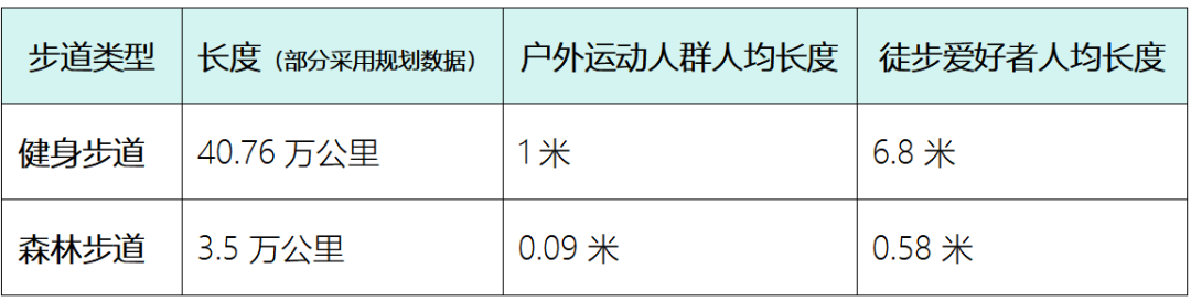 對(duì)比歐美發(fā)達(dá)國(guó)家來(lái)看,美國(guó)經(jīng)過(guò)近60年的建設(shè),國(guó)家級(jí)步道近9萬(wàn)公里,1.76億戶外運(yùn)動(dòng)人群人均享有超5公里,如果算上綜合性步道就更多。