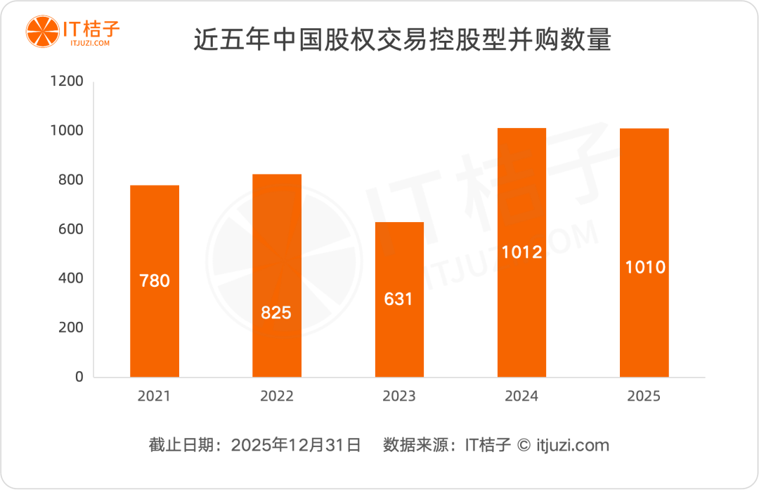 近五年的并購(gòu)市場(chǎng)走出了一個(gè)“V”形反轉(zhuǎn)并企穩(wěn)的軌跡。在經(jīng)歷了 2023 年 631 起的低谷后,市場(chǎng)于 2024 年強(qiáng)勢(shì)反彈,并購(gòu)?fù)顺鍪录?shù)量激增至 1012 起。