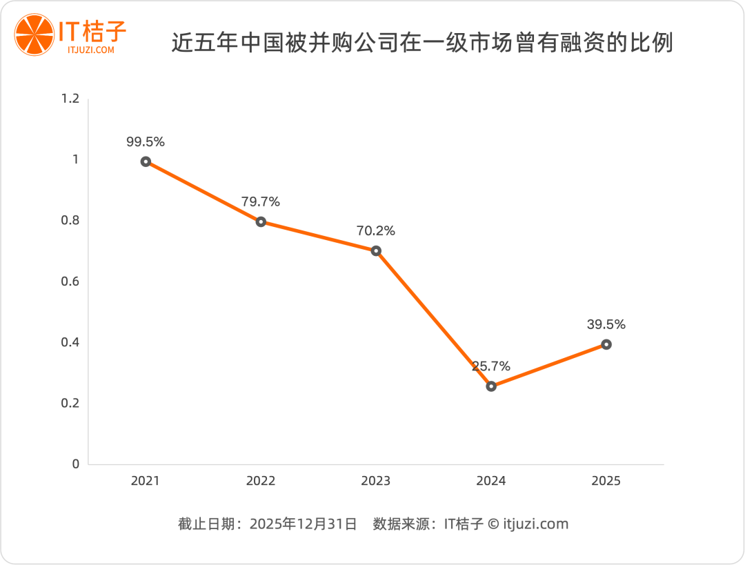 然而,此后該比例持續(xù)下降,至 2024 年降至 25.74% 的最低點(diǎn)。2025 年,這一比例雖小幅回升至 39.48%,但無外部融資背景的企業(yè)已成為并購(gòu)交易中的重要組成部分。