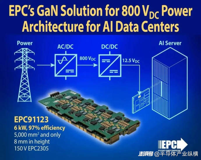 例如,專(zhuān)注于先進(jìn)氮化鎵解決方案的EPC公司推出 EPC91123 評(píng)估板 —— 這是一款緊湊型氮化鎵基 6 千瓦轉(zhuǎn)換器,專(zhuān)為新興AI數(shù)據(jù)中心向800V直流配電轉(zhuǎn)型而設(shè)計(jì)。