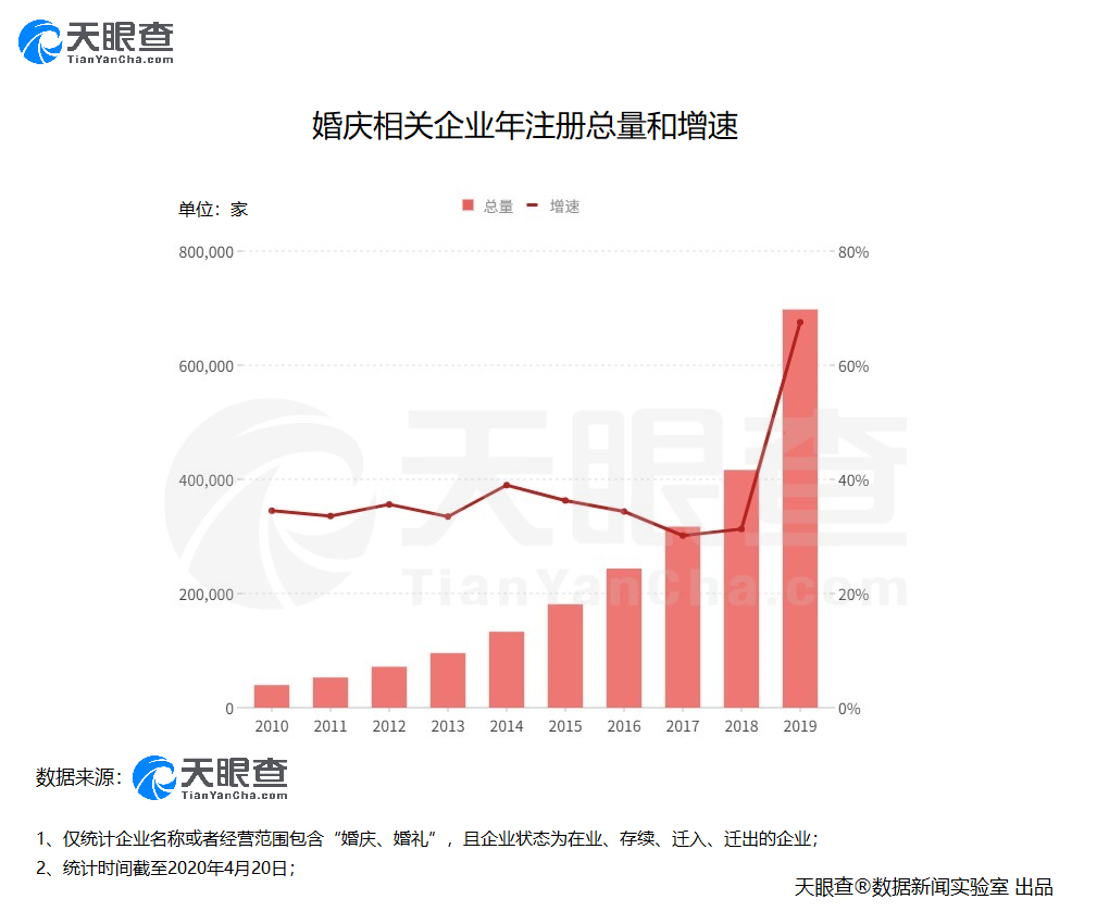 天眼查專業(yè)版數(shù)據(jù)顯示,我國目前有超過73萬家婚慶相關(guān)企業(yè)。從企業(yè)注冊數(shù)量趨勢來看,絕大多數(shù)婚慶相關(guān)企業(yè)成立于2015年之后。值得關(guān)注的是,僅2019年一年內(nèi)注冊成立的婚慶相關(guān)企業(yè)數(shù)量就達到28萬余家,年增速超67.5%,可謂爆發(fā)性增長。